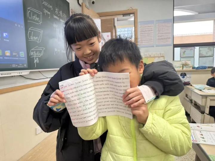 这一年里,女孩做他的英语小老师,从写字习惯开始教起,课堂上提醒他认真听讲,课后陪着他订正错题、复习课文,把帮扶的小事做得细致又耐心。而男孩也没辜负这份陪伴,从一开始的畏难退缩,到后来主动请教、认真练习,一点点跟着女孩的脚步往前走。