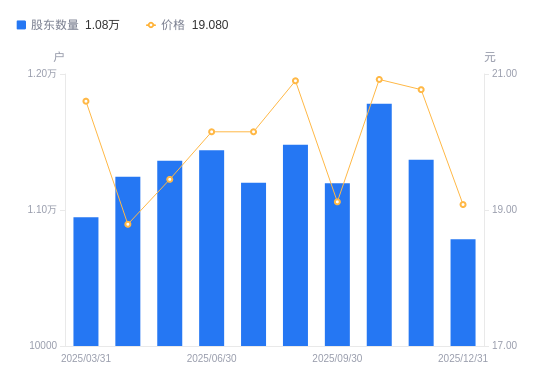 日期A股户数(户)流通A股户均持股数(股)户均持股市值(万元)2025-12-311078513324.3625.422025-11-281136910028.0420.832025-10-31117819677.3420.242025-09-301119610182.9919.472025-08-29114799931.9420.762025-07-311120110178.4520.512025-06-30114409965.8020.082025-05-301136310033.3319.512025-04-301124410139.5219.052025-03-311094610415.5621.46