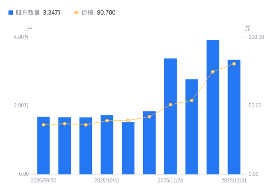 日期A股户数(户)流通A股户均持股数(股)户均持股市值(万元)2025-12-31334075388.0943.482025-12-19392164589.9634.362025-12-10277686482.2834.932025-11-28338385319.4627.022025-11-20184359764.0441.042025-11-131524611806.3846.422025-10-311730810399.8240.742025-10-201663610819.9139.112025-10-101666010804.3239.912025-09-301678410724.5038.82