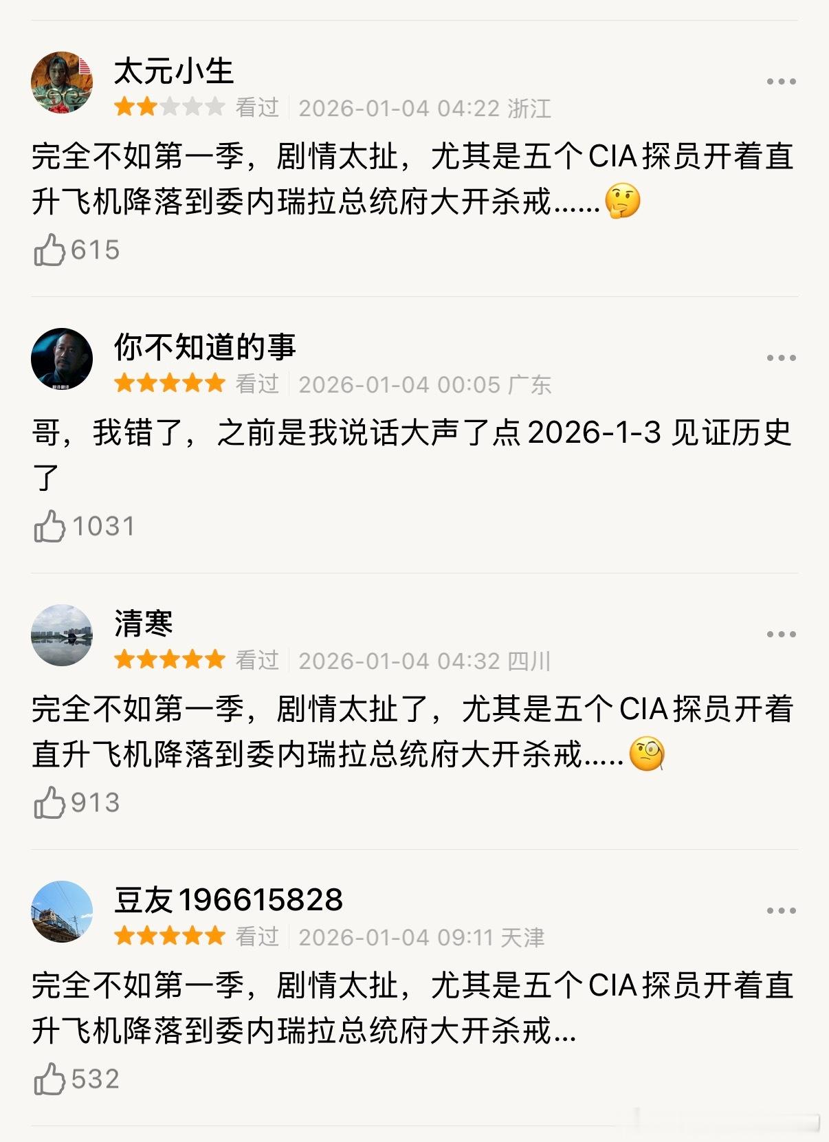 《杰克 莱恩》第二季因为预言了委内瑞拉事件,今天豆瓣从6.3分涨到了7.1分,单日涨了0.8分。。评论区已经开始出现人传人现象 🚬跨年电影愿