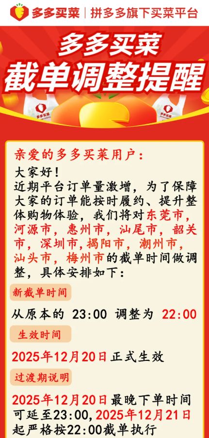 更夸张的是,很多地方的多多买菜直接爆仓了。。。逼得人家连夜发通告,把截单时间提前了整整1个小时。