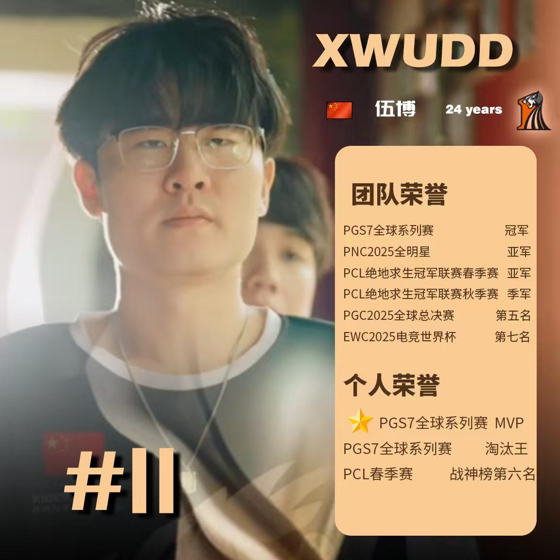 虎扑01月05日讯2025PUBG年度TOP20选手第11名:17-xwudd