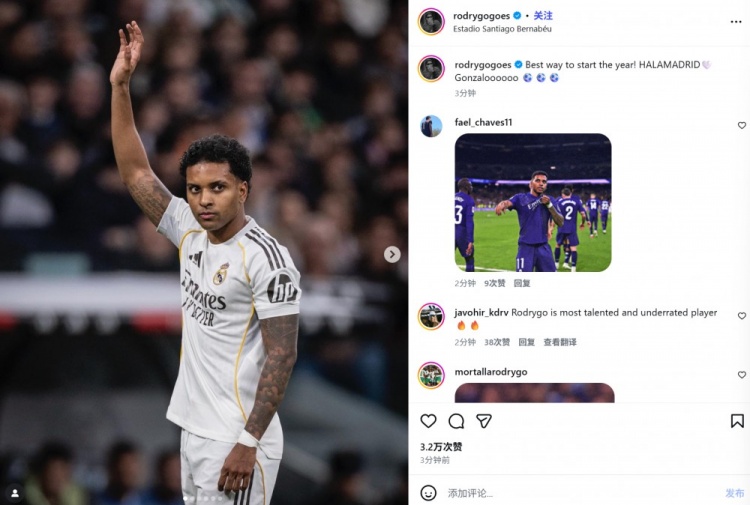 他也在赛后通过社媒晒出自己的比赛照,并配文:“开启新一年的最佳方式,马德里前进!(恭喜)贡萨洛戴帽⚽⚽⚽”