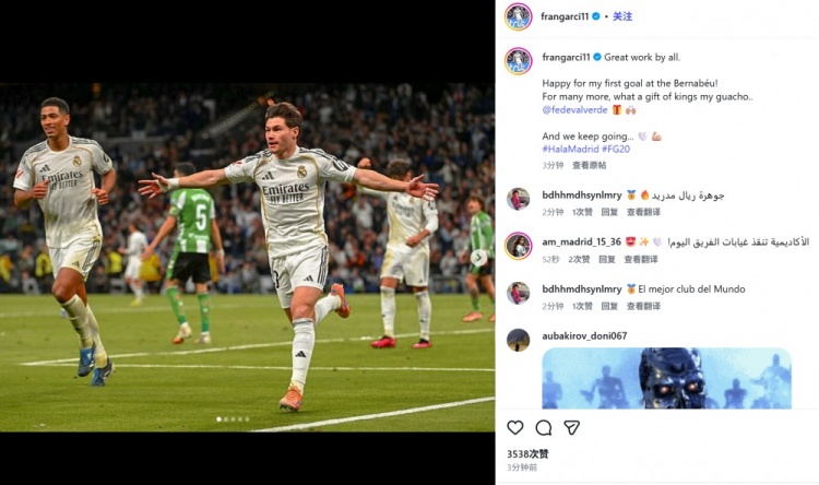 他也在赛后通过社媒晒出自己的庆祝照,并配文:“大家做得太棒了!我很开心收获自己在伯纳乌球场的首球!希望以后还能进更多球,这真是份超棒的圣诞礼物,感谢我的朋友@巴尔韦德🎁🙌🏼继续前进……🤍💪🏼”