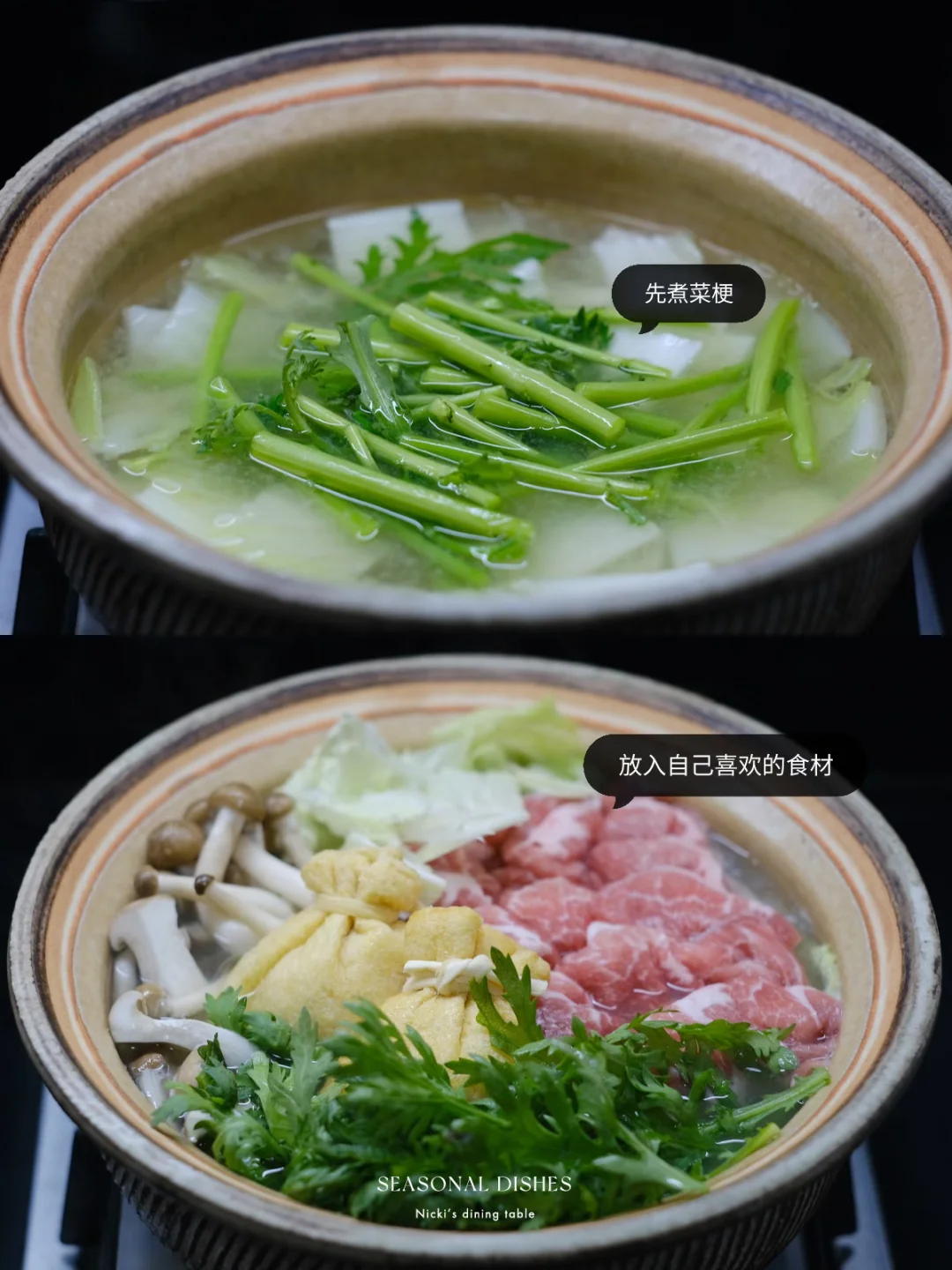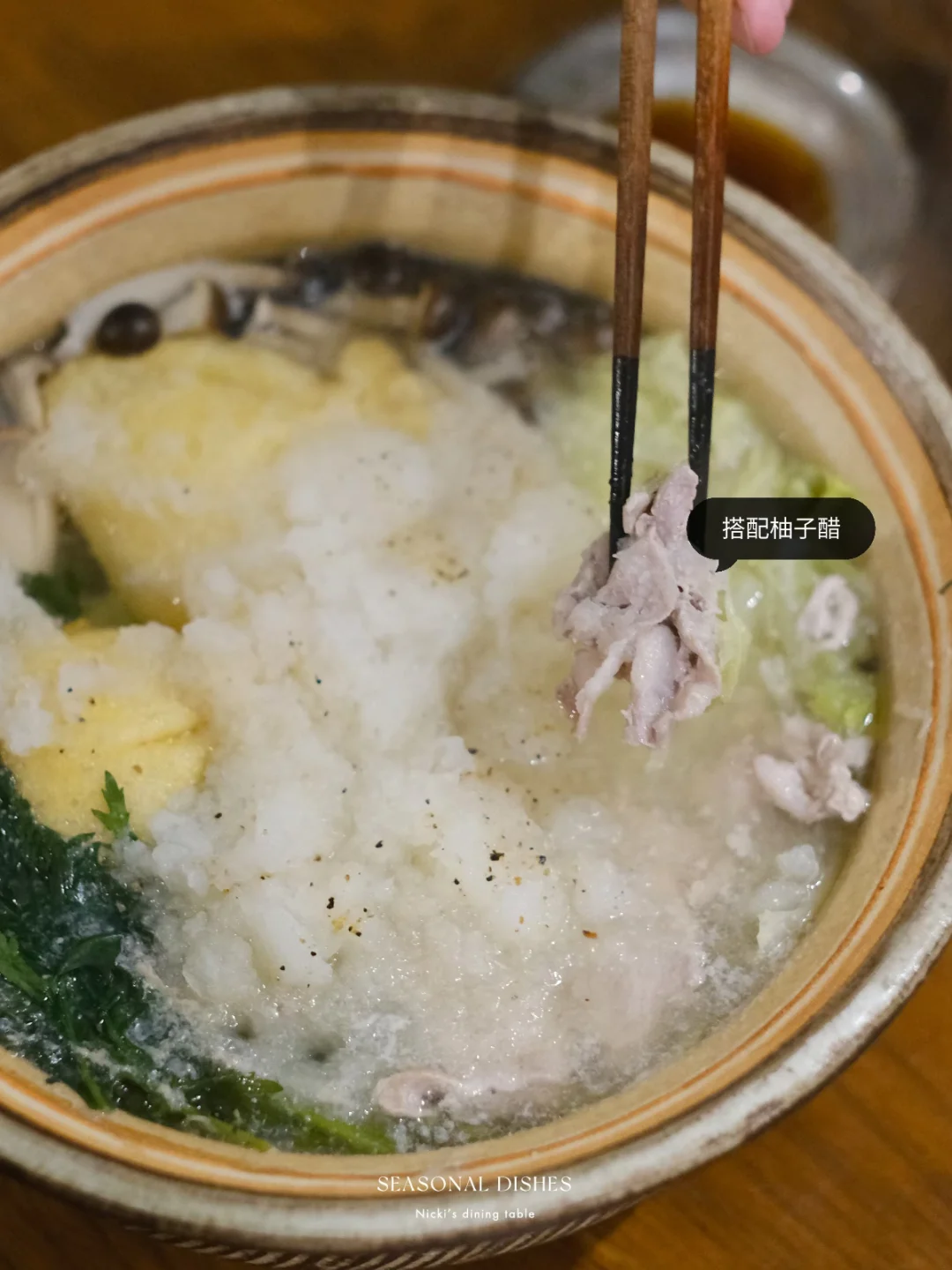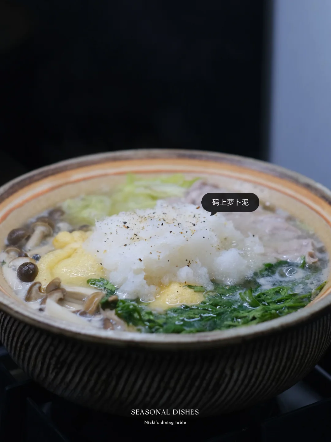 雪见锅是以萝卜泥为特色的日式锅物,透明的萝卜泥宛如下雪浮于汤面,其余食材可以根据个人喜好搭配 - 菜谱: 🔅做法: •白萝卜去皮,磨成泥,沥出水分。 •锅中放入高汤包煮10分钟(昆布+柴鱼花),取出高汤包,加入柚子味噌酱调匀。 •将蔬菜梗先放入锅中煮5分钟左右,再码上其他食材,盖盖煮10分钟左右,用勺子撇去表面浮沫。 •最后,加入萝卜泥,撒上山椒粉,再煮3分钟即可。 📌Tips:吃剩三分之一的时候,可以加入乌冬面和鸡蛋液,煮熟作为主食。