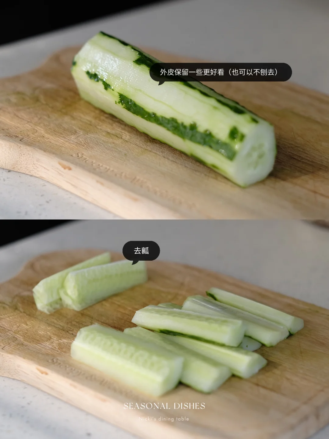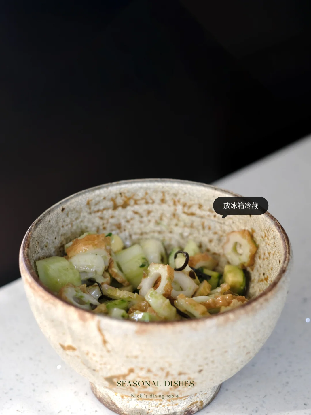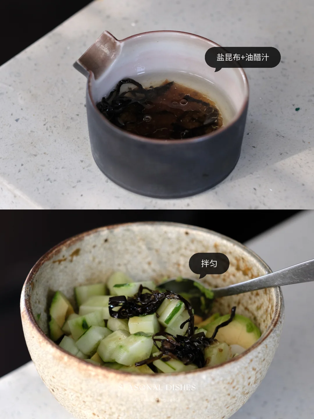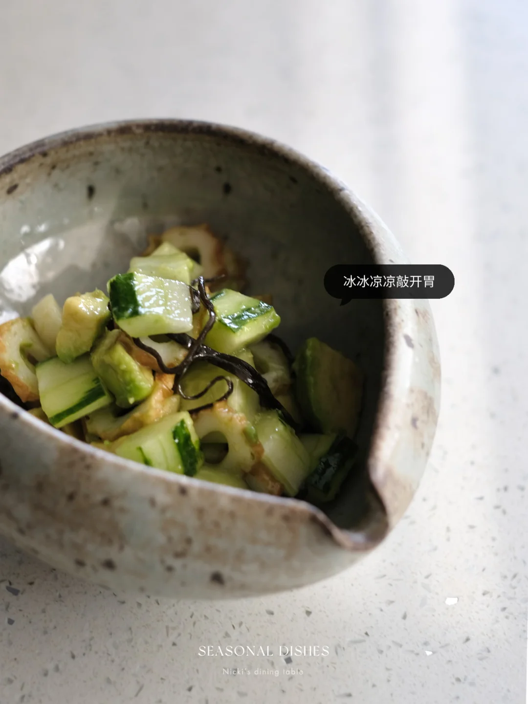 天热在厨房烧完晚餐,胃口已没了一大半,只想吃些凉爽菜开开胃。 - 菜谱:盐昆布拌竹轮牛油果黄瓜 🔅做法: •竹轮放入热水中汆烫片刻,捞出浸冰水沥干,切0.5cm长度。 •牛油果去核去壳切小块。 •黄瓜刨去2/3皮,去瓤,切小块。 🔺酱汁:盐昆布+油醋汁 •将所有食材与酱料拌匀,时间允许可以放冰箱冷藏 日式餐桌|家庭料理| 器物之美|日本作家器|家常菜|晚餐吃什么|夏季餐桌