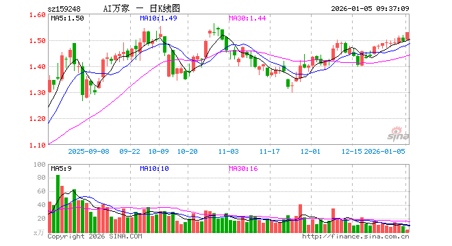 1月5日,人工智能ETF基金(159248)开盘涨0.33%,报1.500元。人工智能ETF基金(159248)重仓股方面,新易盛开盘涨1.42%,中际旭创涨1.82%,寒武纪涨1.43%,澜起科技涨1.44%,中科曙光涨0.21%,科大讯飞涨1.41%,豪威集团涨0.37%,海康威视涨0.13%,浪潮信息涨0.74%,金山办公涨0.34%。