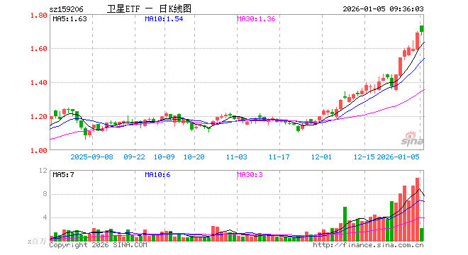 1月5日,卫星ETF(159206)开盘涨2.31%,报1.730元。卫星ETF(159206)重仓股方面,睿创微纳开盘涨1.07%,航天电子涨4.60%,中国卫星涨6.37%,复旦微电涨1.80%,上海瀚讯涨0.60%,中兴通讯涨0.00%,华力创通涨3.77%,电科芯片涨0.28%,隆盛科技跌1.41%,振芯科技涨0.07%。