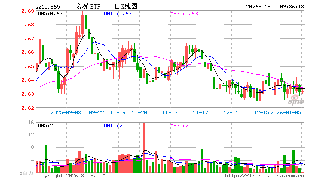 1月5日,养殖ETF(159865)开盘涨0.00%,报0.631元。养殖ETF(159865)重仓股方面,牧原股份开盘涨0.04%,温氏股份跌0.36%,海大集团跌0.20%,新希望涨0.11%,梅花生物涨0.20%,大北农涨0.00%,圣农发展涨0.00%,生物股份涨0.13%,天康生物涨0.14%,立华股份跌0.43%。