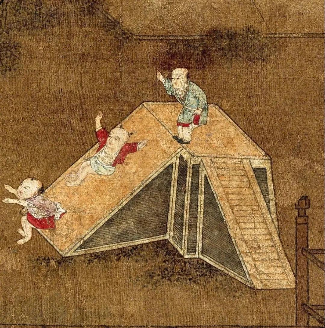 没想到宋朝时期小祖宗们就已经玩上滑梯了!如这幅《婴戏图》中的木制滑梯,是宋元孩童经典游乐设施,结构为斜坡加阶梯,看上去已经与现代滑梯形制相近。