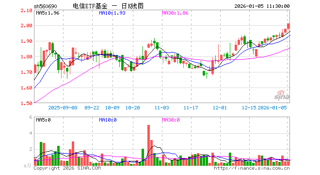 1月5日,截止午间收盘,电信ETF基金(560690)涨1.82%,报2.011元,成交额96.13万元。电信ETF基金(560690)重仓股方面,中际旭创截止午盘涨1.97%,新易盛跌0.51%,中国联通涨0.39%,中国移动跌0.57%,中国电信涨0.16%,银之杰涨1.57%,中国卫通涨9.99%,中兴通讯涨1.08%,天孚通信涨0.16%,紫光股份涨2.36%。
