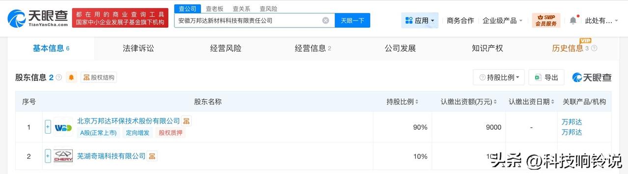 【万邦达、奇瑞汽车合资公司登记成立 注册资本1亿】 天眼查工商信息显示,近日,安徽万邦达新材料科技有限责任公司成立,法定代表人为孟亮,注册资本1亿人民币,经营范围为新材料技术推广服务、皮革制品制造、皮革制品销售、汽车装饰用品制造、汽车装饰用品销售、汽车零部件及配件制造等。股东信息显示,该公司由万邦达(300055)、芜湖奇瑞科技有限公司分别持股90%、10%。 据媒体报道,近日,万邦达发布对外投资进展公告,宣布与芜湖奇瑞科技共同出资设立合资公司,以推进总投资10亿元的淮南环保新材料汽车内饰项目实施。 天眼查信息: