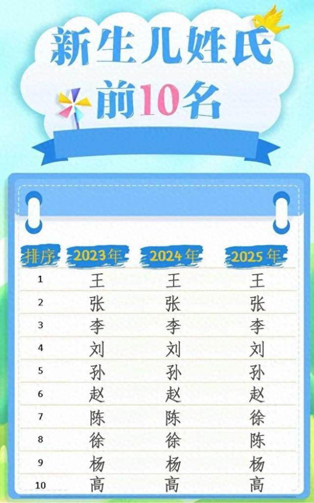 2025年,在临沂市办理出生登记的新生儿姓氏前10名分别是“王”“张”“李”“刘”“孙”“赵”“徐”“陈”“杨”“高”,与往年相比排名略有变动,但并无新的姓氏冲入前十。