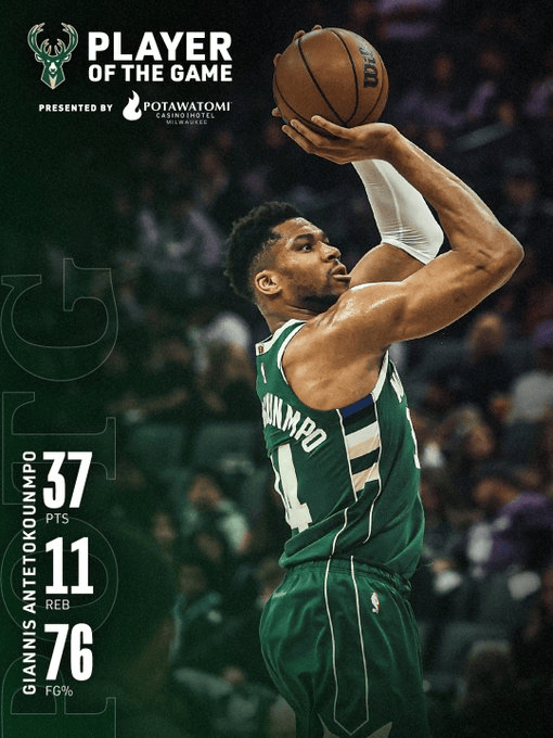 本场比赛,雄鹿球员扬尼斯-阿德托昆博出战31分钟,17投13中,罚球13投11中,得到37分11篮板1助攻。