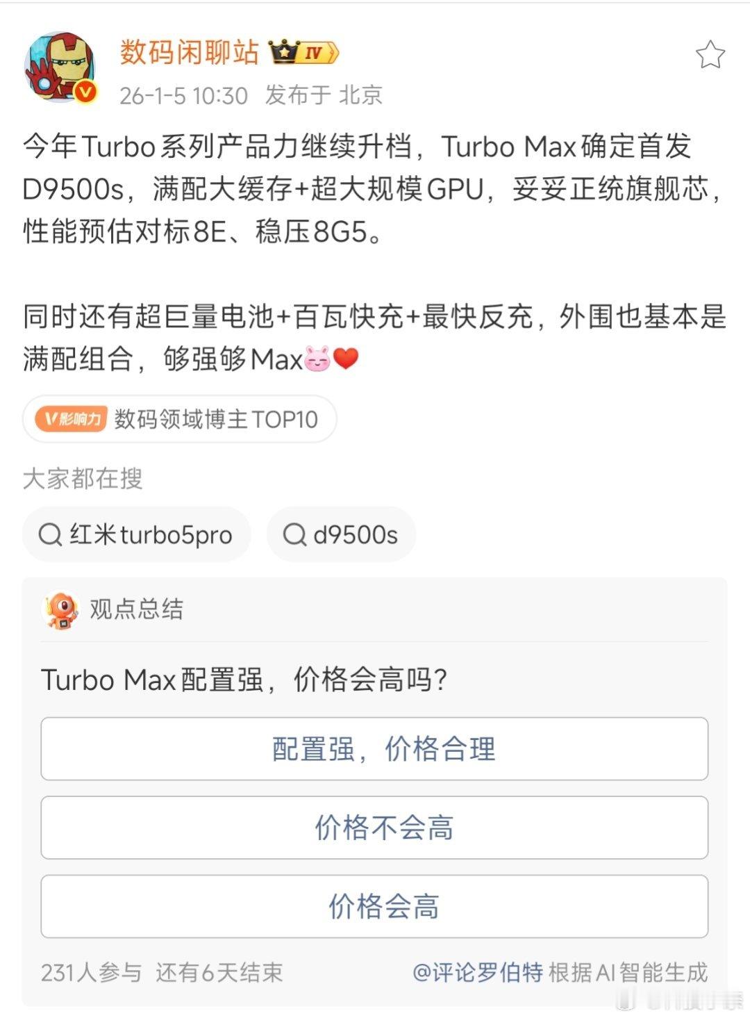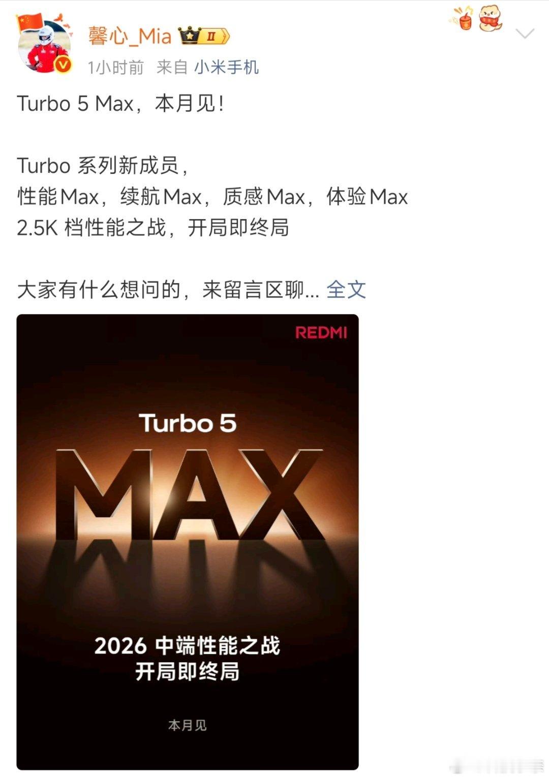 官宣,REDMI Turbo5 MAX本月见!将接档K系列,迎来全面Max,并且根据汽车命名规则来看的话,Max的定位自然是要在Pro之上的。再加上站哥爆料或将首发9500s,以及大缓存+超强GPU,那么这款2.5K档的性能之王,绝对值得期待一下!