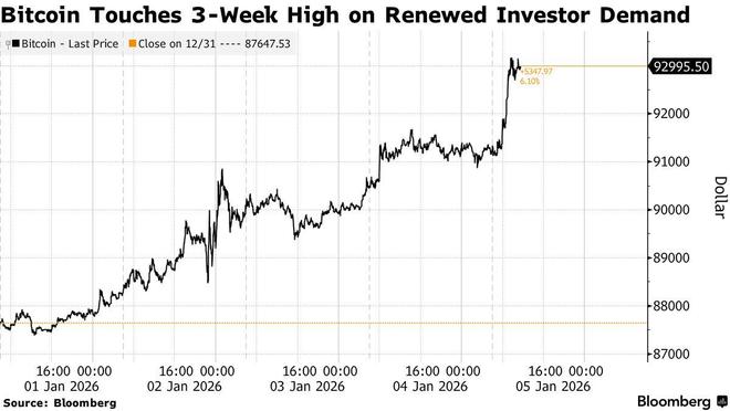 智通财经APP获悉,比特币周一一度上涨2.3%,至93,323美元,为12月11日以来的最高水平;以太坊及其他加密货币也小幅走高。此次上涨发生在亚洲市场整体表现积极的背景下——在科技和人工智能相关押注的推动下,亚洲股市纷纷刷新历史高点。与此同时,在美国于周末对委内瑞拉发起“斩首式”军事行动、强行抓捕委内瑞拉总统马杜罗后,投资者涌向贵金属避险,黄金周一一度上涨2%,突破每盎司4,400美元,白银最高涨幅达4.8%。