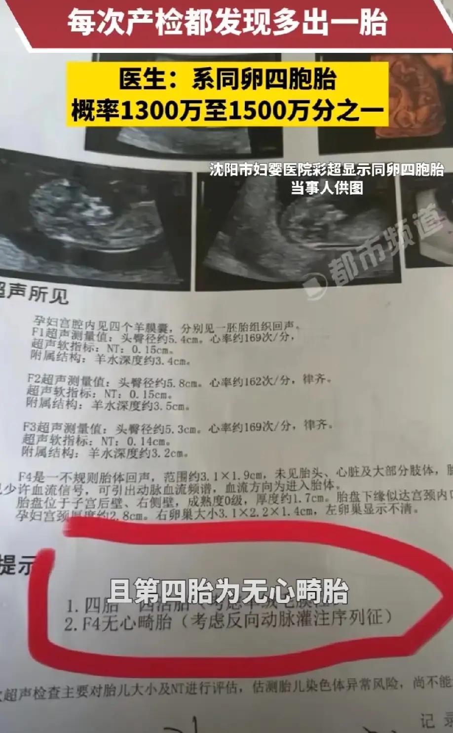 大千世界 无奇不有 一孕妇两个月内从一胎变四胞胎,每次产检都发现多出一胎,医生:系同卵四胞胎,概率1300万至1500万分之一 这位充满戏剧性经历的孕妇是辽宁抚顺的王女士,今年刚满30岁。她和家人本来只盼着一个新生命的到来,去年9月自然受孕成功后,全家人都沉浸在即将为人父母的喜悦里,没人想到这份喜悦会一次次被加倍放大。 王女士的产检之路像开盲盒一样充满意外。去年11月第一次去抚顺市妇幼保健院检查,彩超显示是单胎,她和丈夫还特意给宝宝起了小名。没过多久复查,医生指着屏幕告诉她是双胎,夫妻俩当场愣住,半天没反应过来,回家后连夜收拾出两个婴儿床的位置。 第三次产检更让人惊喜,报告上明确写着三胎,医生笑着说这种情况实属罕见,让她多注意休息。连续三次产检每次都多一个宝宝,王女士又开心又忐忑,为了确认准确情况,12月她特意去了沈阳市妇婴医院复检,这次的结果让所有人都意外,彩超显示是四胎。 医生解释,王女士怀的是同卵四胞胎,形成过程特别特殊。一个卵子和一个精子结合成受精卵后,没有正常发育成一个胚胎,而是连续分裂成了四个,这四个宝宝的基因几乎完全一样,长相也会高度相似。这种情况的概率只有1300万到1500万分之一,比中彩票头奖还要难得。 不过喜悦中也藏着担忧,第四次产检发现第四个胎儿是无心畸胎,没有胎头、心脏和大部分肢体,却能通过血管和其他三个胎儿相连,靠另外三个宝宝供血存活。医生说,如果不干预,长期供血可能导致正常胎儿出现贫血、心衰等问题,严重影响发育。 王女士怀孕16周时,身体曾出现过恶心、头晕的不适症状,好在没有孕吐反应,后来慢慢恢复了正常。她的预产期已经提前到今年5月,医生给出了专业建议,目前有胎儿射频消融术、激光凝固术等成熟手段,可以切断无心畸胎的供血,避免影响其他胎儿。 但治疗也存在风险,医生提醒如果后期发现有胎儿心衰需要减胎,可能会导致所有胎儿流产。权衡之下,医院建议她先观察静养,根据后续胎儿发育情况再做决定。王女士和家人商量后,计划前往上海和安徽的大型医院复检,寻求更全面的诊疗方案。 同卵四胞胎属于高危妊娠,四个胎儿共用一个胎盘,血管相互交织,不仅胎儿发育风险高,孕妇也容易出现妊娠期高血压、糖尿病等并发症。医生强调,多胎妊娠的早产率远高于单胎,新生儿可能面临呼吸窘迫、感染等问题,需要全程严密监测。 王女士的经历在网上传开后,很多网友都为她送上祝福,也有人分享了类似的罕见案例。有人说这是上天送来的四份礼物,也有人担心孕期风险,提醒她一定要遵医嘱休养。从一个宝宝到四个宝宝,两个月内的四次惊喜,让这个普通家庭的生活充满了未知与期待。 王女士现在每天都会轻轻抚摸肚子,感受四个小生命的动静。她知道未来的孕期之路不会轻松,但看着检查报告上的胎心信号,她和家人都充满了信心。这份1300万分之一的幸运,承载着太多的期待与牵挂。 (来源:极目新闻(记者:马浩然) 版权归属原作者 如有侵权请联系删除㉖)