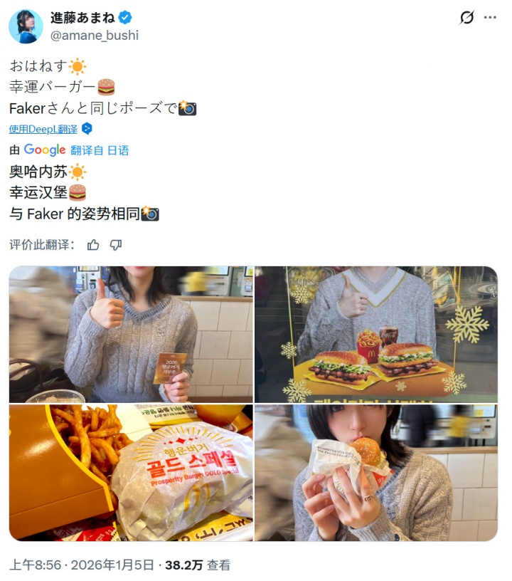 日本美女声优进藤天音晒照:与Faker选手相同的姿势