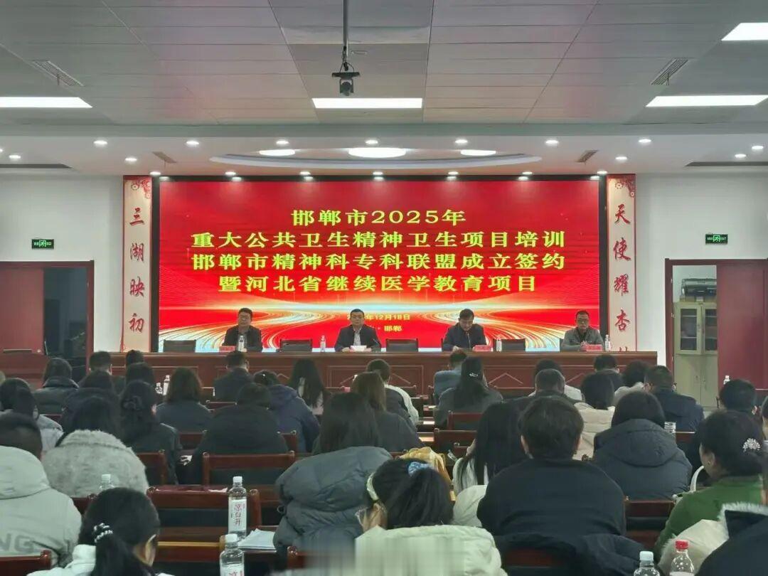 邯郸市中西医结合医院成功举行邯郸市精神科专科联盟成立签约仪式。邯郸市卫生健康委医政处处长刘欣;邯郸市中西医结合医院党委副书记、院长宋利宏,党委副书记、副院长邓国兴,副院长胡新磊出席培训会。各县(市、区)的卫健局主管局长、医政科长、项目办主任、精神病医院院长等共同见证这一重要时刻。会议由胡新磊主持。