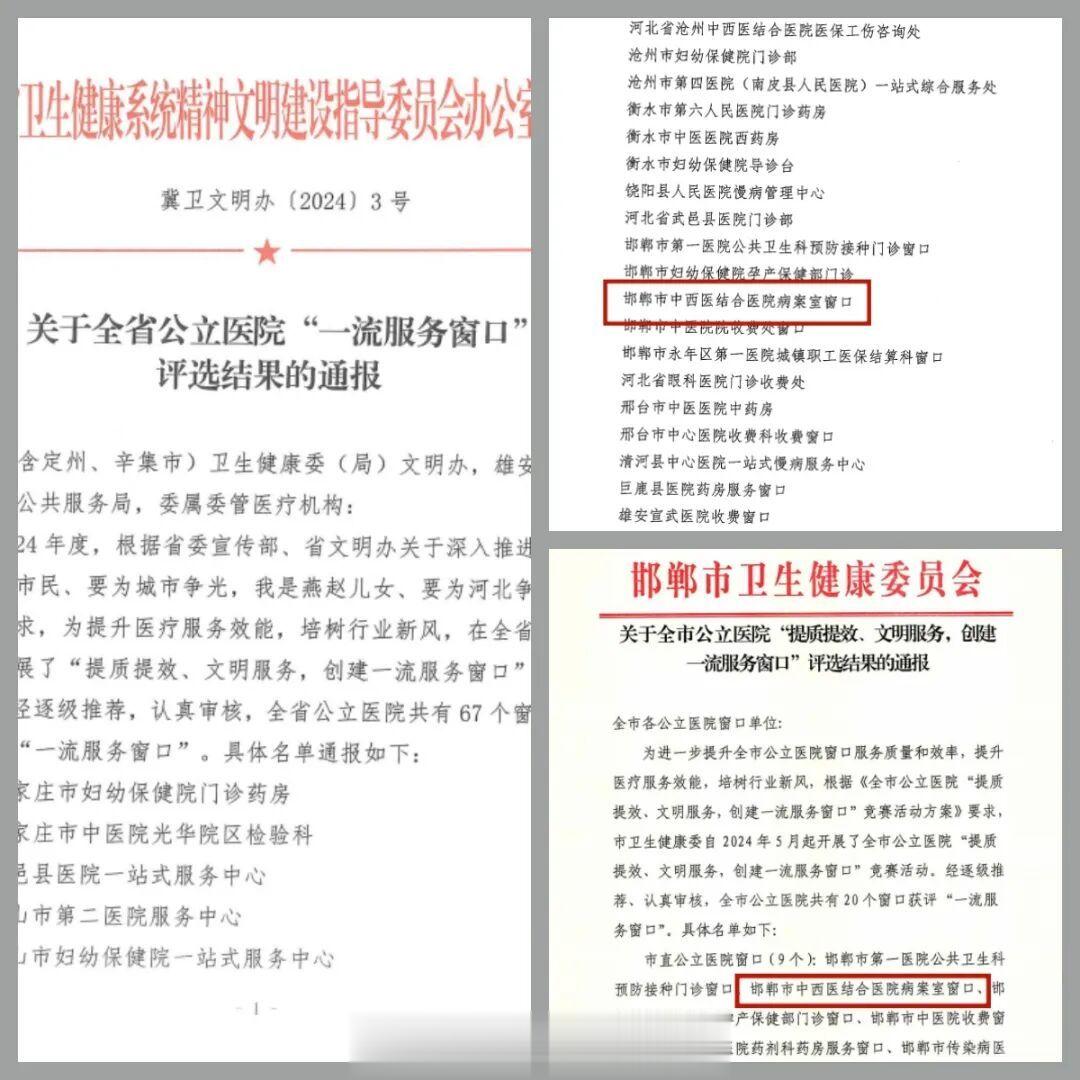 在2024年度全省公立医院“提质提效、文明服务,创建一流服务窗口”活动,以及2024年邯郸市举办“提质提效、文明服务,创建一流服务窗口”活动中,邯郸市中西医结合医院病案室窗口被评选为省、市两级一流服务窗口,荣获省级“一流服务窗口”以及邯郸市“一流服务窗口”的称号。