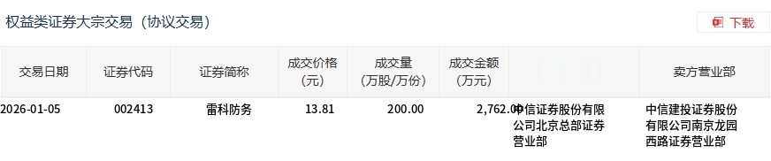 1月5日,雷科防务大宗交易成交200万股,成交额2762万元,占当日总成交额的6.67%,成交价13.81元,较市场收盘价13.81元持平。
