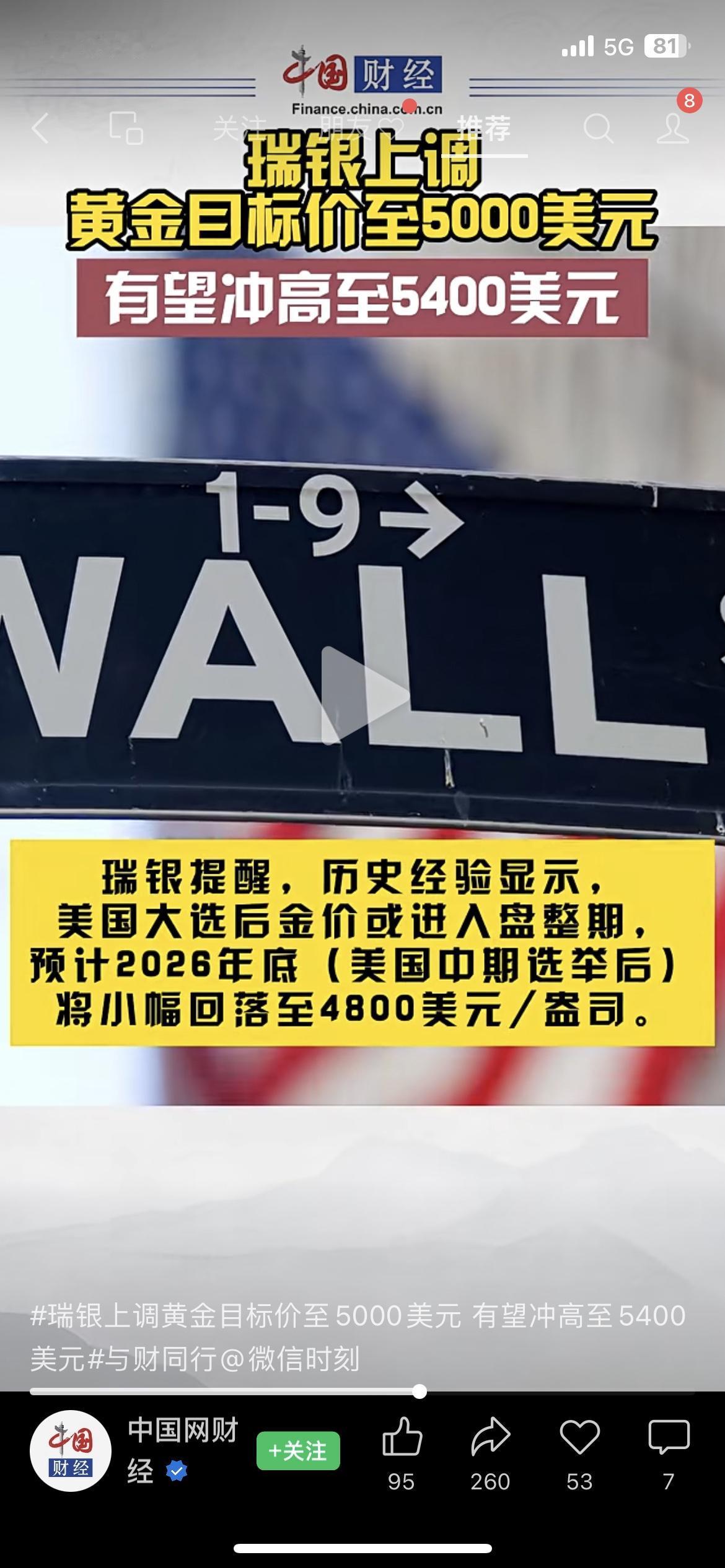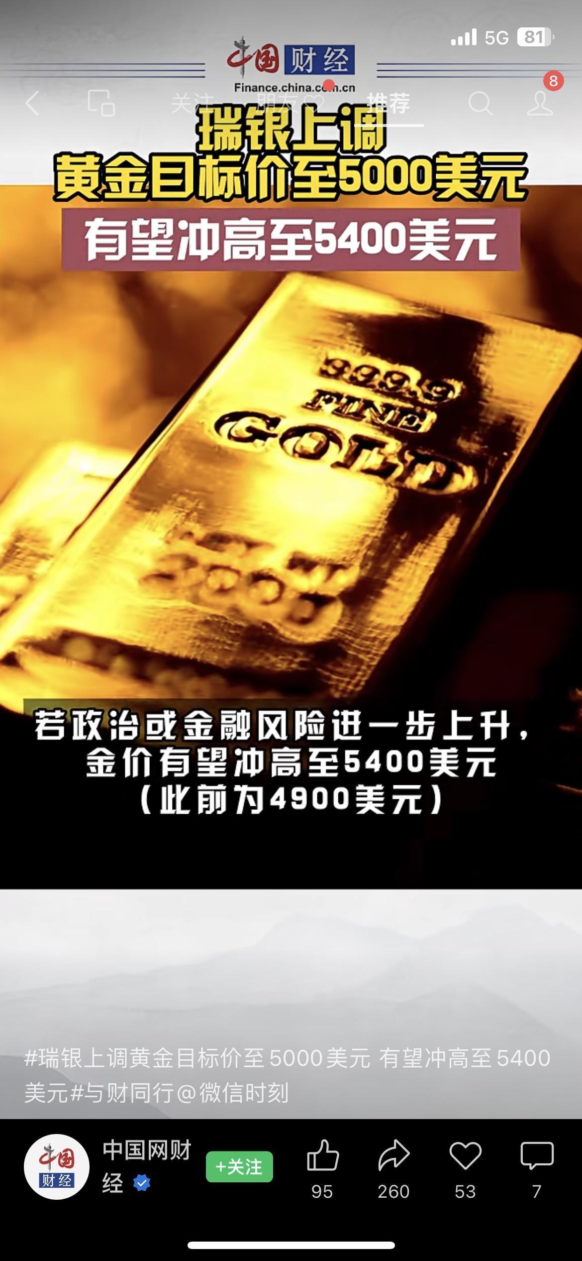 瑞银炸锅!黄金目标价直冲5000美元,还能冲更高? 瑞银突然放大招,直接把黄金目标价从4500美元/盎司上调到5000美元/盎司!更夸张的是,要是政治或金融风险再升级,金价甚至有望冲到5400美元/盎司(之前才预期4900美元)。 但瑞银也泼了盆冷水:看历史规律,美国大选后金价大概率会盘整,预计2026年底中期选举后,金价会回落至4800美元/盎司。 手里有黄金的朋友,是趁高止盈还是继续拿着?没入场的要不要跟风?评论区等你的看法! 黄金 瑞银 财经热点 投资理财