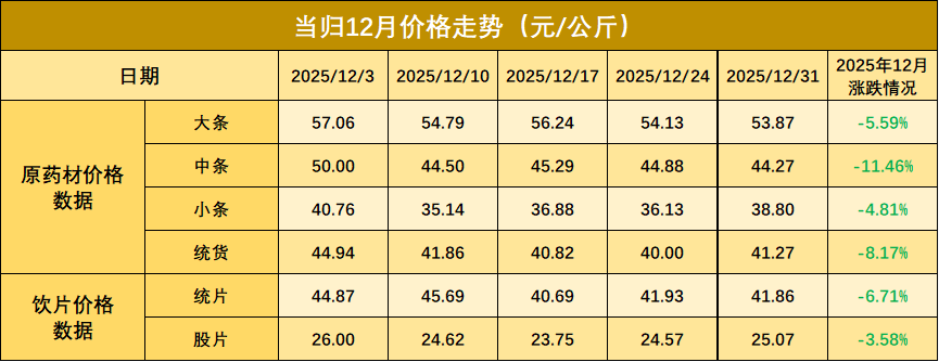 12月上旬及中旬,受新产季干货大量上市及外地低价货源流入主产区的冲击,市场一度呈现“量大无价”的局面,导致主导品种价格出现明显回调。进入下旬,随着冬季滋补消费进入旺季,叠加节假日前药企及终端备货需求全面启动,市场交易活跃度回升,带动指数止跌回暖。