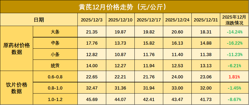 12月份黄芪走势呈现窄幅震荡的态势。12月初黄芪新货上市与冬季滋补需求形成博弈,各规格黄芪价格维持在12-45元/公斤之间。月中虽一度受供应量增加影响面临下行压力,但随着气温下降,黄芪作为冬季大宗滋补品的终端消耗加快,优质规格货源询价热情提升,支撑价格止跌企稳并小幅回升。进入下旬,在节假日备货需求的拉动下,黄芪整体交易较为活跃。截至12月末,各规格黄芪价格收于11-41元/公斤之间。