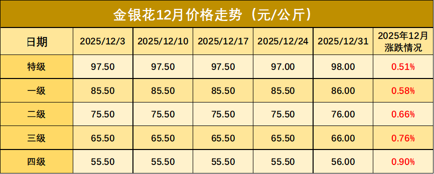12月份金银花行情始终保持平稳,波动极小。12月初各规格金银花价格保持在55.5-97.5元/公斤之间,由于12月处于金银花的种植休眠期且非产新季节,市场交易主要依赖既有库存消化,供需双方处于相对平衡状态。全月未受新货或突发性需求干扰,金银花价格既无新货冲击的压力,也无大幅上涨的动力,全月维持窄幅整理走势。截至12月末,各规格金银花价格收于56-98元/公斤之间。