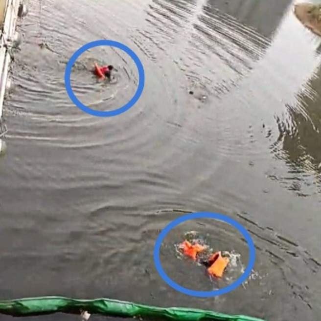 两民警向落水女子游去。通讯员熊静怡供图