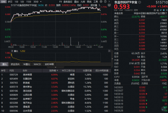 成份股方面,白酒龙头集体猛攻。截至收盘,贵州茅台大涨3.54%,山西汾酒涨3.08%,五粮液、泸州老窖、洋河股份等涨超1%。部分大众品亦涨幅居前,燕京啤酒、东鹏饮料双双收涨超4%。