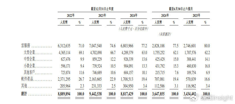 时至今日,用友的各类客户数量仍在增加。截至2025年9月30日止的九个月,采用用友云服务的大型企业、中型企业及小微企业客户数量分别为6065家、13837家及491043家,而2024年同期,上述数据分别为5650家、11540家及463757家。
