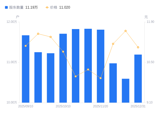 日期A股户数(户)流通A股户均持股数(股)户均持股市值(万元)2025-12-311119149412.5010.372025-12-191059109946.0711.532025-12-101097369599.3010.692025-11-201180928920.018.882025-10-311183008904.329.132025-10-201182358909.228.922025-10-101170778997.349.782025-09-301122449384.7510.682025-09-191125049363.0510.762025-09-101166879027.419.99