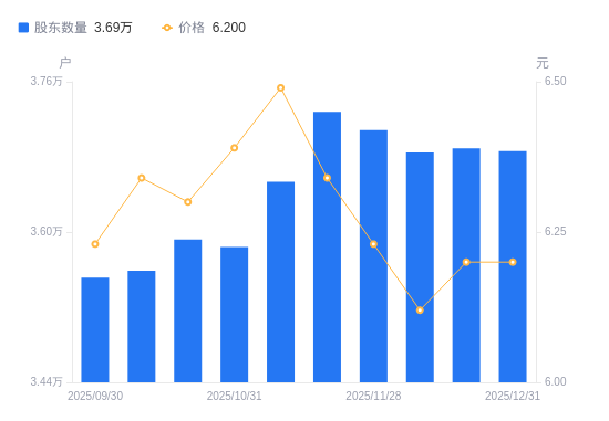 日期A股户数(户)流通A股户均持股数(股)户均持股市值(万元)2025-12-313686221160.4913.122025-12-193689121143.8613.112025-12-103684821168.5312.962025-11-283708421033.8213.102025-11-203728020923.2313.272025-11-103653521349.8813.862025-10-313584021763.9013.912025-10-203592221714.2113.682025-10-103558721918.6213.902025-09-303551621962.4413.68