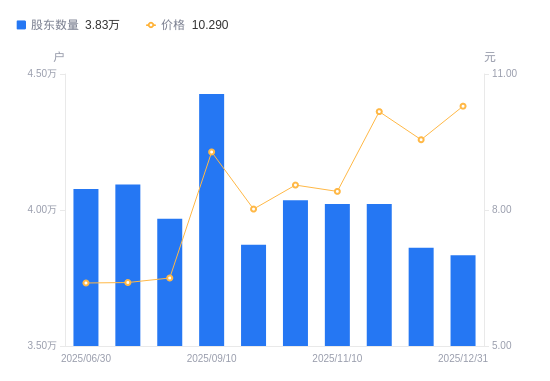 日期A股户数(户)流通A股户均持股数(股)户均持股市值(万元)2025-12-313833344268.2045.552025-11-283861243948.3341.972025-11-204022542186.0342.902025-11-104022542186.0335.482025-10-314035542050.1335.952025-09-303872243823.4935.152025-09-104426538335.7735.582025-07-313968242763.2927.802025-07-184093841451.2926.532025-06-304077141621.0826.60