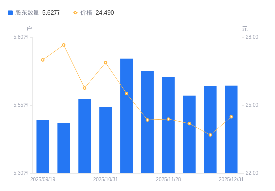 日期A股户数(户)流通A股户均持股数(股)户均持股市值(万元)2025-12-315622011035.7527.032025-12-195620811038.1026.152025-12-105585211108.4626.872025-11-285653910973.4826.762025-11-205674810933.0726.622025-11-105721510843.8327.672025-10-315542811193.4430.092025-10-205571911134.9828.682025-09-305484711312.0131.292025-09-195496011288.7530.48