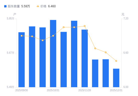 日期A股户数(户)流通A股户均持股数(股)户均持股市值(万元)2025-12-315587325758.1016.642025-12-195636625532.8116.882025-12-105635325538.7017.062025-11-285792424846.0517.572025-11-205839124647.3417.382025-11-105780524897.2017.552025-10-315843024630.8817.002025-10-205804124795.9616.912025-10-105809224774.2017.072025-09-305778524905.8217.19