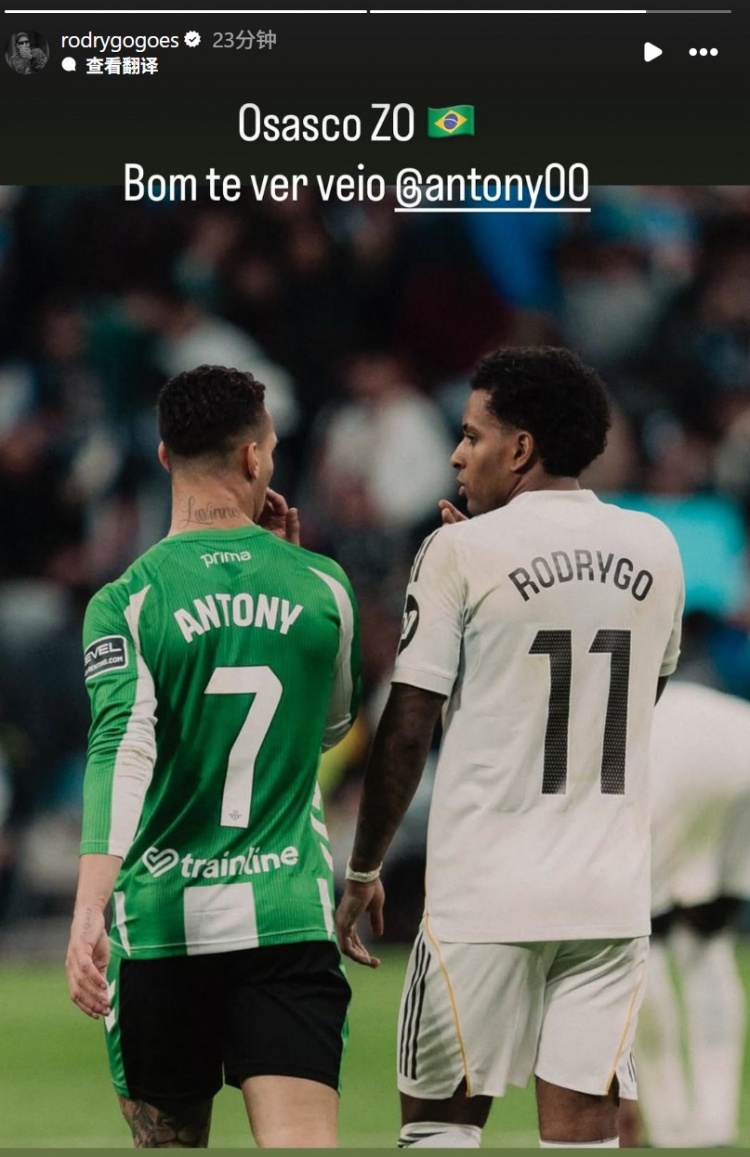罗德里戈在个人社媒晒出与贝蒂斯球员安东尼的合照,配文写道:“很高兴见到你!”