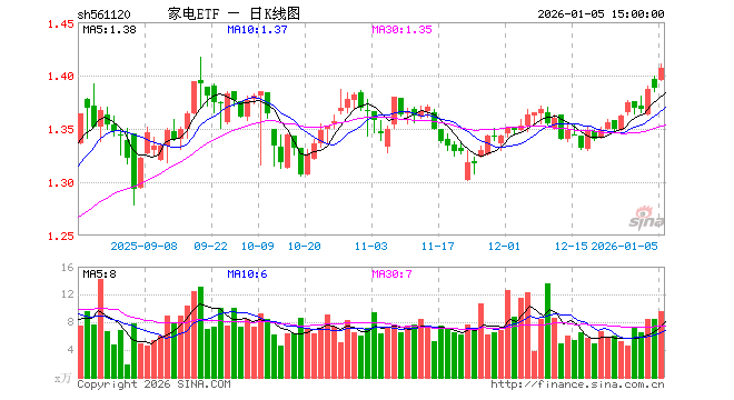 1月5日,家电ETF(561120)涨1.37%,成交额1356.76万元。当日份额减少150.00万份,最新份额为6715.99万份,近20个交易日份额减少3150.00万份。最新资产净值计算值为9458.80万元。