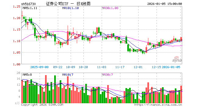 1月5日,证券公司ETF(516730)涨1.55%,成交额1259.65万元。当日份额减少50.00万份,最新份额为9788.08万份,近20个交易日份额减少900.00万份。最新资产净值计算值为1.09亿元。
