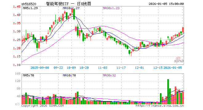 1月5日,智能驾驶ETF(516520)涨2.88%,成交额8345.10万元。当日份额增加2600.00万份,最新份额为5.28亿份,近20个交易日份额增加2.16亿份。最新资产净值计算值为6.96亿元。