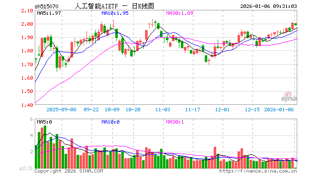1月6日,人工智能AIETF(515070)开盘跌0.25%,报2.000元。人工智能AIETF(515070)重仓股方面,新易盛开盘跌3.90%,中际旭创跌2.81%,寒武纪跌0.72%,澜起科技涨0.98%,中科曙光涨0.23%,科大讯飞涨0.43%,豪威集团涨0.11%,海康威视涨0.10%,浪潮信息涨0.15%,金山办公跌0.41%。