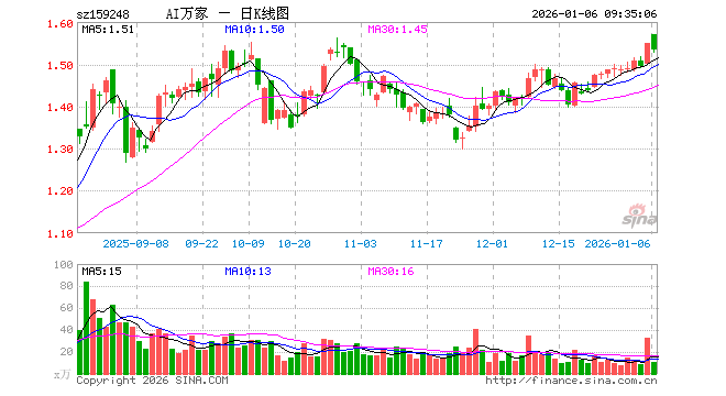 1月6日,人工智能ETF基金(159248)开盘涨1.36%,报1.570元。人工智能ETF基金(159248)重仓股方面,新易盛开盘跌3.90%,中际旭创跌2.81%,寒武纪跌0.72%,澜起科技涨0.98%,中科曙光涨0.23%,科大讯飞涨0.43%,豪威集团涨0.11%,海康威视涨0.10%,浪潮信息涨0.15%,金山办公跌0.41%。