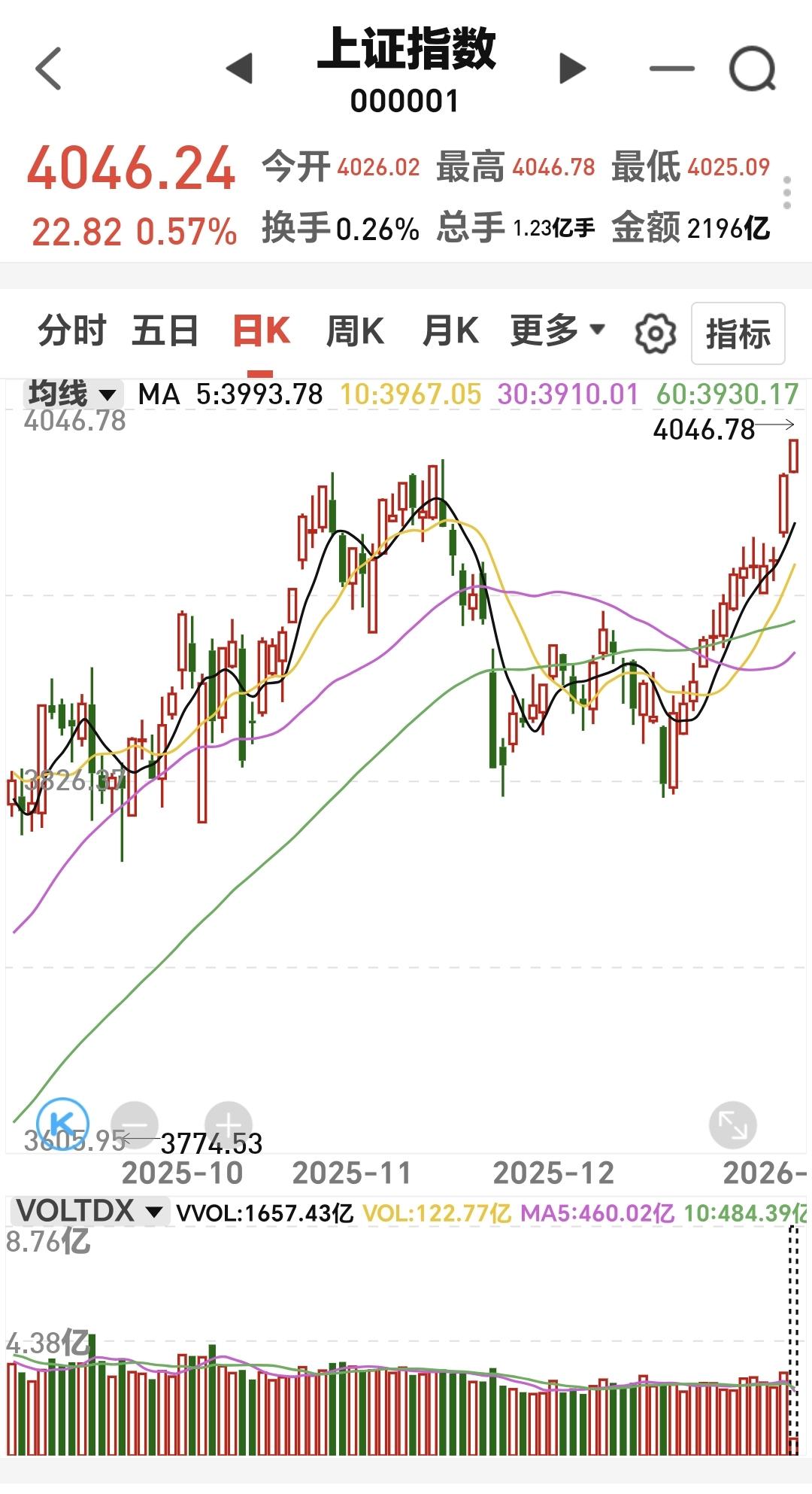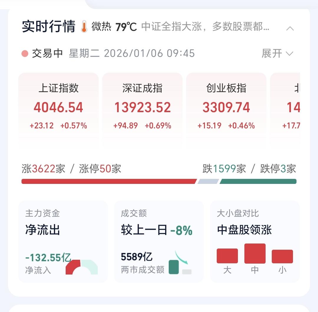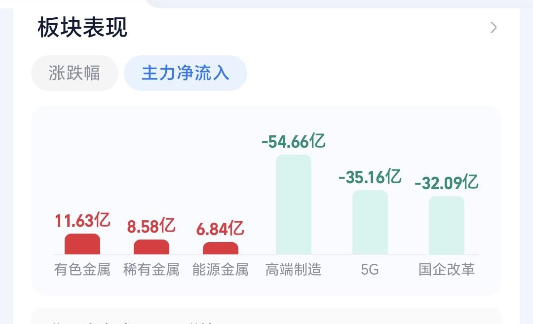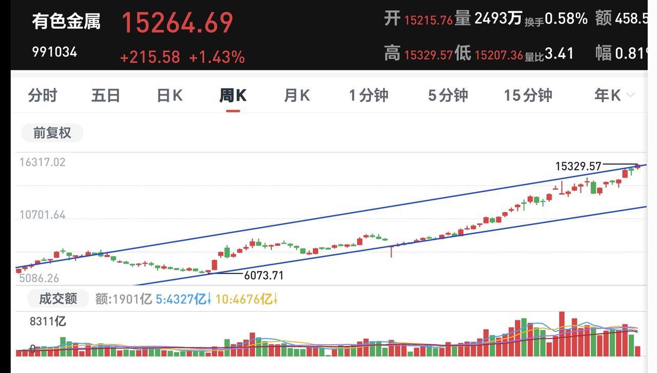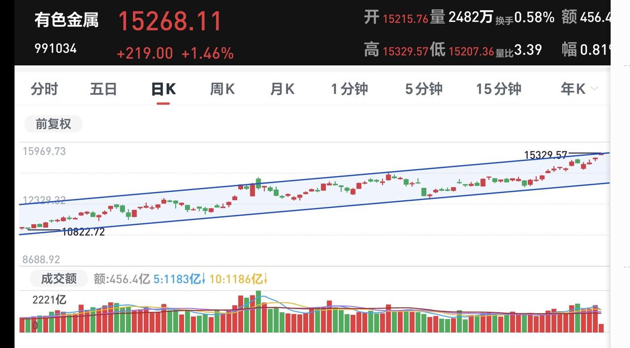 基金:有色金属板块大涨,近期可不可以进场 今天市场开盘涨跌不一,创业板指低开,上证指数和深成指高开,创业板指开盘下跌了0.45%,开于3279点,上证指数开盘上涨了0.06%,开于4026点。 开盘以后,三大指数都是向上,创业板指也已经翻红,上证指数更是创了十几年以来的新高,突破了前高4034点。 今天黄色线在蓝色线上方,但两条线之间的敞口不大,后面继续观察两条线的位置会不会有变化。 现在两市累计成交5589亿,相比于昨天同期缩量了8%,今天没有能够做到温和放量。 现在市场上涨3622家,下跌1599家,涨停50家,跌停3家,这样的数据还是可以的,上涨家数大幅度超过了下跌家数。 我们来看一下下面的截图7,这是主力资金进出板块的情况,主力资金净流入最多的三个板块是:有色金属板块,稀有金属板块,能源金属板块,主力资金净流出最多的三个板块是:高端制造板块,5G板块,国企板块。 持有的基金中,估值上涨幅度最大的三个板块是:芯片半导体板块,证券板块,上证50板块,下跌幅度最大的三个板块是:军工板块,5G板块,医疗板块,估值整体上涨了7149元。 今天上涨幅度排名前三的板块是:有色金属板块,半导体板块,稀土永磁板块,其他上涨幅度比较大的板块见下面的截图10。 我们来看一下下面的截图11,这是有色金属板块日K线图,从图中可以看出,我画了两条倾斜向上的斜线,这是有色金属板块日线级别上涨通道,今天的上涨已经来到了这个上涨通道上轨线上,继续观察能不能突破这个上轨,如果能够有效突破,就会有可能走一个加速走势。 我们来看一下下面的截图12,这是有色金属板块周K线图,从图中可以看出,我画了两条倾斜向上的斜线,这是有色金属板块周线级别上涨通道,本周的上涨已经突破了这个上涨通道的上轨,也就是说,有色金属板块周线级别有可能会走加速走势。 有色金属板块日线级别和周线级别的趋势都是向上,持有的人可以继续持有,只是现在都已经来到了上涨通道的上轨附近,所以,想进场的人需要谨慎。 我每天都会分享我的观点,我的观点只代表我个人的看法,不能作为你操作的依据,据此操作后果自负。