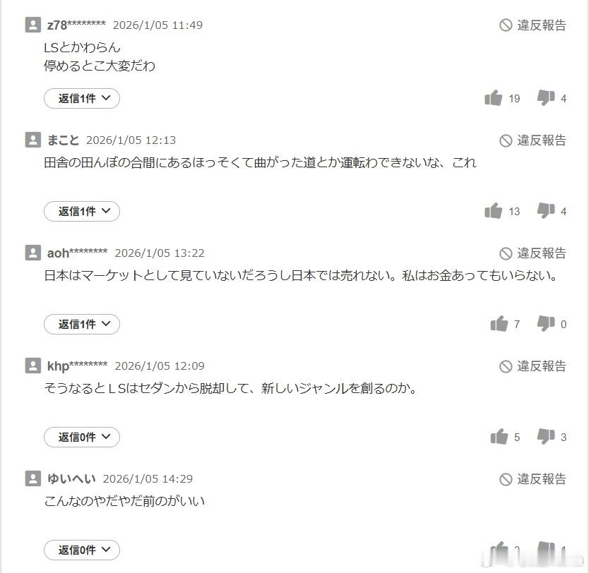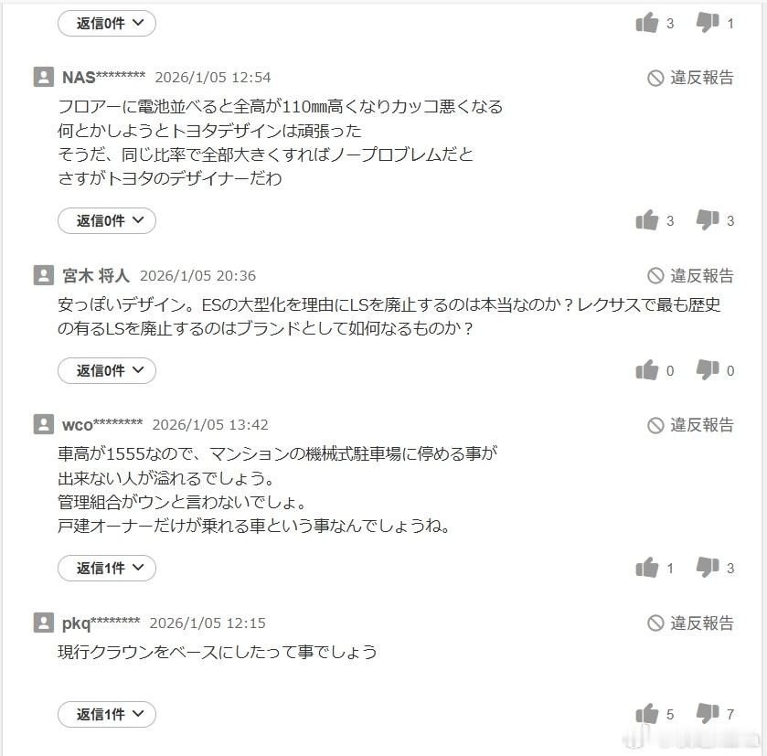 日本人对汽车尺寸有多在意,从第八代雷克萨斯ES的评价可见一斑:——5.1米的长度,这在田舍乡间的小路根本开不动吧,咋转弯呢?——这设计好土啊,ES巨大化,然后停掉LS,对不对?作为一个豪华品牌,废除雷克萨斯历史最悠久的LS,意味着什么?——车高1555mm连立体停车场都进不去的fw——电池放车底,车身高了110mm,就长这鬼样了我觉得雷克萨斯ES巨大化是非常正确的决定,十年前ES比BBA的C-segment轿车更有竞争力的源头,就是因为尺寸大了半级,空间大了一整级。这是横置咸鱼小汽车的优势。今天宝马5系加长后也来到了5.1米,奥迪A6L也跟上了,只有奔驰E级还在5.0米。那么雷克萨斯ES想要获得优势,尺寸上不能输给BBA的行政级轿车,特别是在日本,ES好不容易在价格和档次上跟5系平起平坐,因为尺寸而输掉?怎么可能。大v聊车 坂道说日系车全是乐子