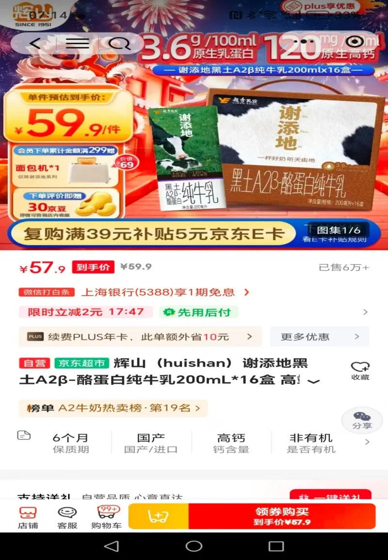 近期,多家媒体报道,谢添地在北京市场推出了多款低价新品,部分产品单价已经降至“3元档”。京东平台显示,辉山牛奶京东自营店中一款250毫升10瓶装的黑土有机纯牛乳售价为44.5元,优惠后价格为39.5元,折合单瓶不足4元。与此同时,该产品的蛋白质含量仅为3.6g,相较此前所发布的黑土娟姗奶(4.3g)减少了0.7克。另一款名为谢添地黑土A2β-酪蛋白纯牛乳(200ML16盒)售价为59.9元,折合单瓶售价3.75元。
