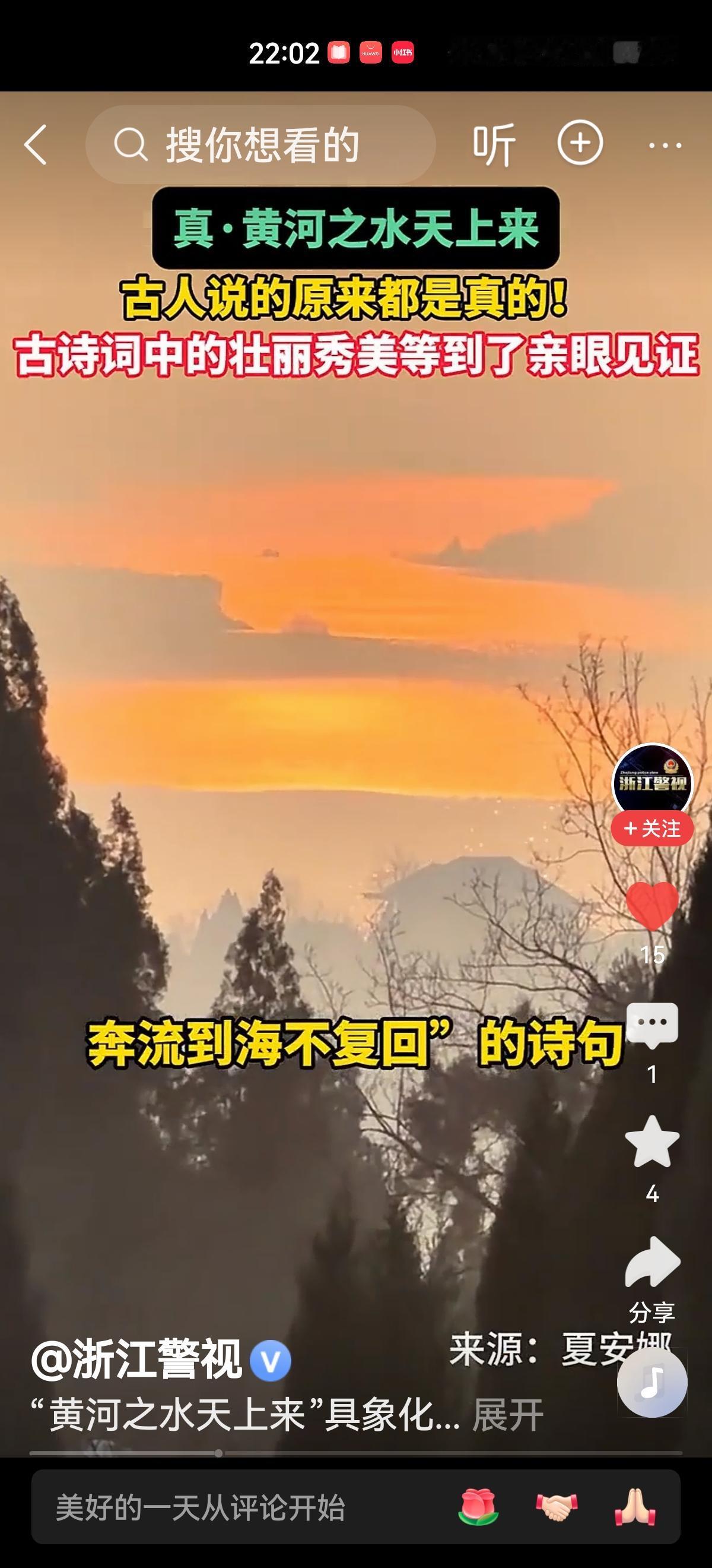 古诗词当中的一些意象化的描述,让人理解起来有些抽象,原因竟然是我们对于自然现象的观察不够仔细,从而限制了我们的想象。古代诗人之所以能够写出那些千古名句,源于诗人细致入微得观察和具象的思维,让大自然的神奇幻想照进了现实。 日前,一位网友拍到了“黄河之水天上来”的奇妙景像,本以为是远处一片金黄的晚霞,拉近镜头才发现,原来是波澜壮阔的大河美景。这一刻,让诗人笔下的黄河的壮美具象化了。同样也有网友拍摄到了鸟群迁徙化作的“北冥有鱼”,让我们再次领略了古诗中的山河壮丽。