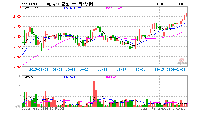 1月6日,截止午间收盘,电信ETF基金(560690)涨0.70%,报2.026元,成交额119.59万元。电信ETF基金(560690)重仓股方面,中际旭创截止午盘跌3.53%,新易盛跌2.91%,中国联通涨0.58%,中国移动跌0.07%,中国电信跌0.32%,银之杰涨3.02%,中国卫通涨8.02%,中兴通讯涨1.36%,天孚通信跌1.83%,紫光股份涨0.40%。