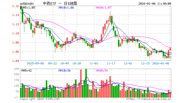 1月6日,截止午间收盘,中药ETF(560080)涨0.38%,报1.067元,成交额4141.95万元。中药ETF(560080)重仓股方面,云南白药截止午盘涨0.05%,片仔癀涨0.39%,同仁堂涨0.22%,东阿阿胶涨2.03%,吉林敖东涨2.94%,华润三九跌0.24%,白云山涨0.15%,以岭药业涨0.40%,佐力药业跌0.24%,达仁堂涨0.11%。