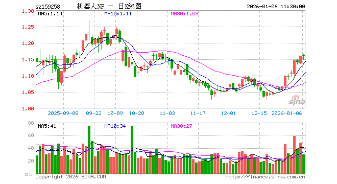 1月6日,截止午间收盘,机器人ETF南方(159258)跌0.09%,报1.159元,成交额3526.68万元。机器人ETF南方(159258)重仓股方面,汇川技术截止午盘跌0.14%,科大讯飞涨0.00%,石头科技涨2.57%,大华股份涨0.42%,中控技术涨0.06%,大族激光跌0.96%,双环传动跌1.49%,科沃斯涨0.10%,机器人跌0.70%,云天励飞涨0.54%。